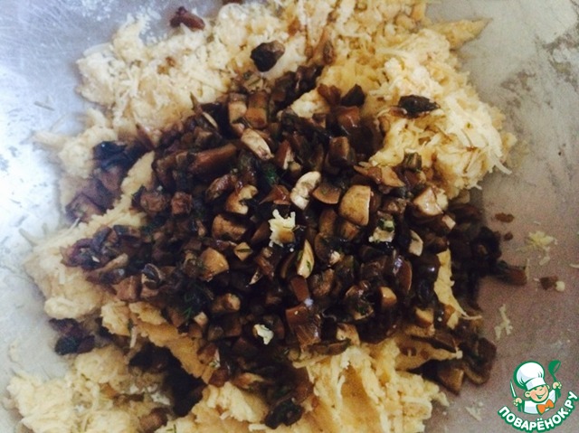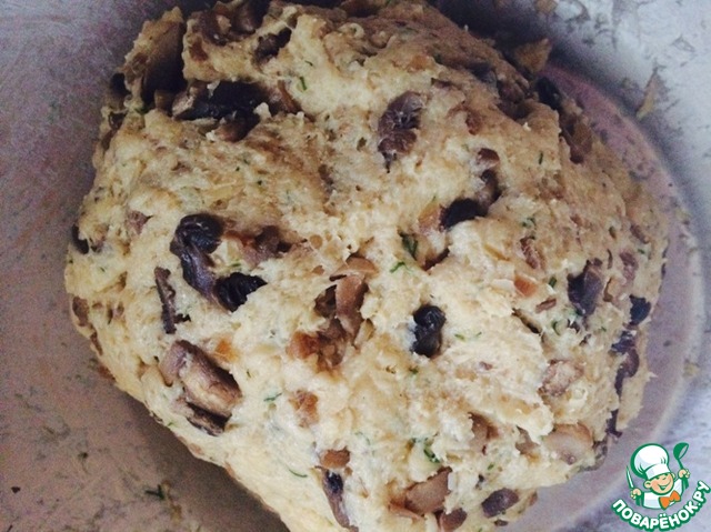 Вымешиваем тесто, чтобы грибки равномерно распределились по всей массе. Тесто месится очень легко, на это у вас уйдет меньше минуты. Тесто получится не слишком плотным. Отправляем его в морозилку минут на 15 отдохнуть.