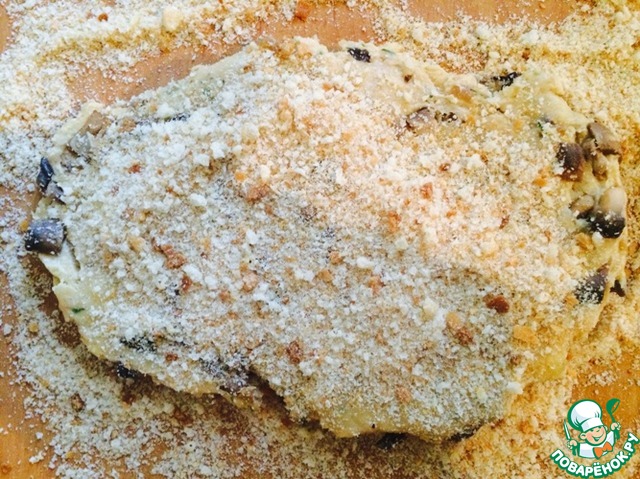 Достаем тесто из морозилки и делим на 3 части (примерно). Рабочую поверхность стола щедро посыпать панировочными сухарями. Именно они дадут потрясающий хруст печенькам. Кладем кусок теста на сухари, руками его немного распределяем по столу, сверху еще посыпаем сухарями и раскатываем в тонкий пласт (ориентировочно - 3 мм). Катается легко и не рвется.