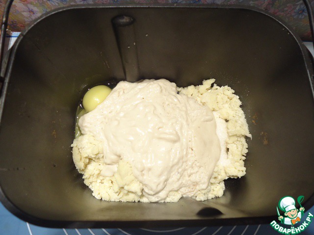 Я загружаю все ингредиенты для теста в ведерко для хлебопечки - подошедшие дрожжи со сметаной и сахаром, муку со сливочным малом, оставшийся сахар, яйца, щепотку соли, щепотку ванилина и ставлю на режим замеса теста - на 20 минут. Тесто можно замесить и руками.
