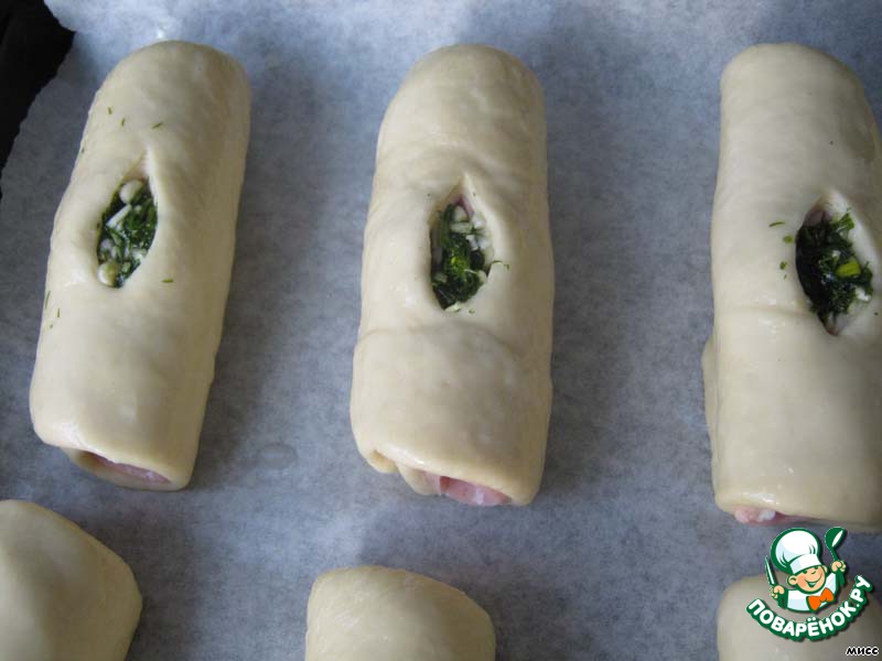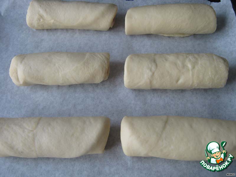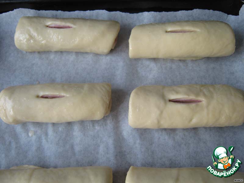 Тесто делим на 10 равных частей, раскатываем в овал, соизмеримый с размерами колец ветчины. Ветчину укладываем на раскатанное тесто.