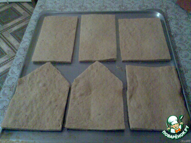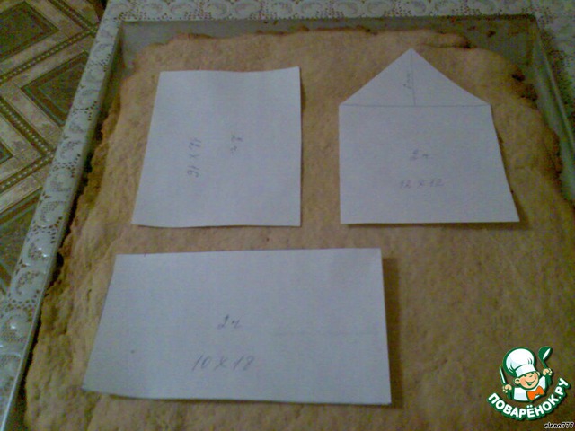 Когда первый корж будет готов, не остужая, накладываем шаблоны и вырезаем 3 запчасти. Так же поступаем и со вторым коржом.