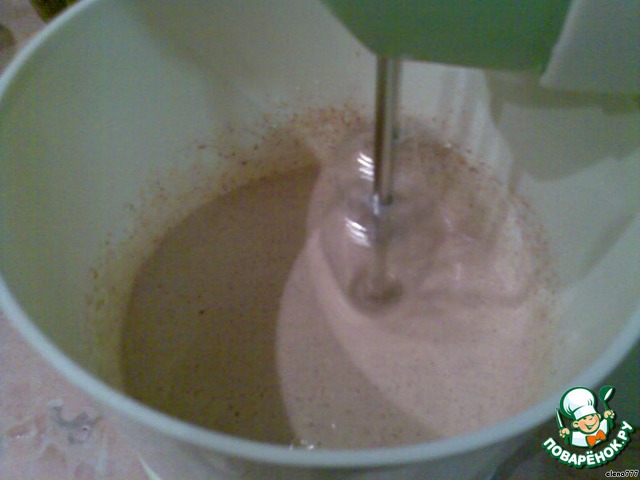 Замесить тесто: желтки двух яиц (белки пока убрать в холодильник) и одно целое яйцо взбить с сахаром до однородной массы, добавить пряности, ванилин, соду и сок лимона, взбивать до появления пены.