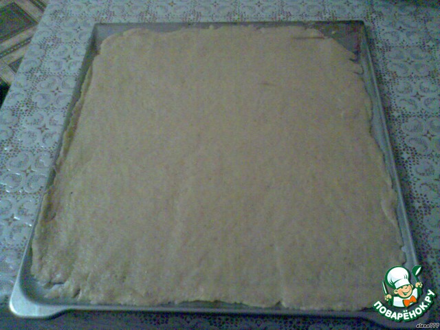 Минут через 15 смажьте плоский противень растительным маслом и раскатайте на нём тесто, поставьте в разогретую духовку на 15-20 минут и выпекайте при температуре 180 градусов. У меня из такого количества теста получилось 2 больших коржа. Постарайтесь не пересушить коржи, а то они будут жестковатыми. Уже минут через 10 проверьте на готовность, если ещё не готов, то пусть немного подрумянится ещё.