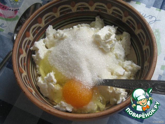Тем временем сделать начинку - смешать творог, сахар, ванильный сахар и яйцо.