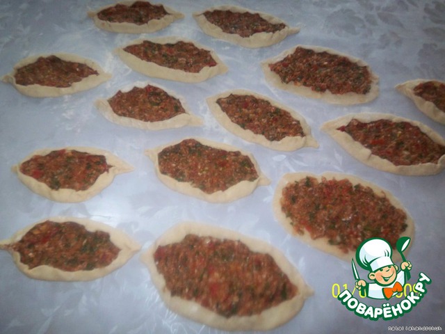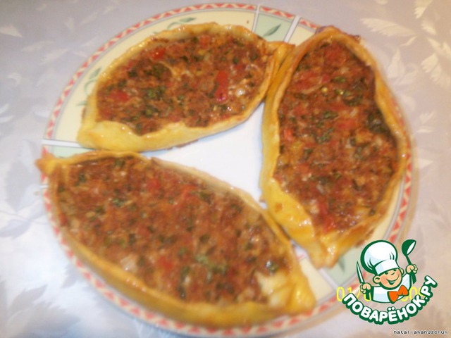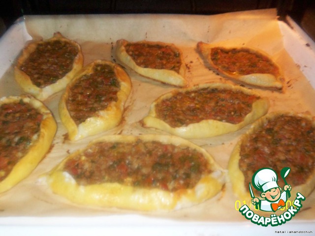 | Пиде похоже на пиццу с мясным фаршем, но начинка такааая... сочная из-за большого количества в ней овощей: лука, петрушки, помидоров... И томатная паста с чесноком тоже придает начинке приятный вкус и аромат... Пробовали это блюдо, когда были в Турции в отпуске... Там эти лепeшки пекли прямо на улице (на территории отеля) в печке (похожей на русскую). И тесто делали, и сами пиде у всех на глазах... Выпекая, они их сразу раздавали на тарелки, т. к. уже здесь же стояла очередь за ними... Аромат везде стоял такой замечательный... ММММ... Когда приехала домой, сразу же стала искать этот рецепт в интернете и... вот нашла и уже успешно пеку их 2 года Если пеку их вечером, то на утро ничего не остаeтся... (у нас семья из 4 -х человек) Ещe бывают пиде с творогом и зеленью... |
