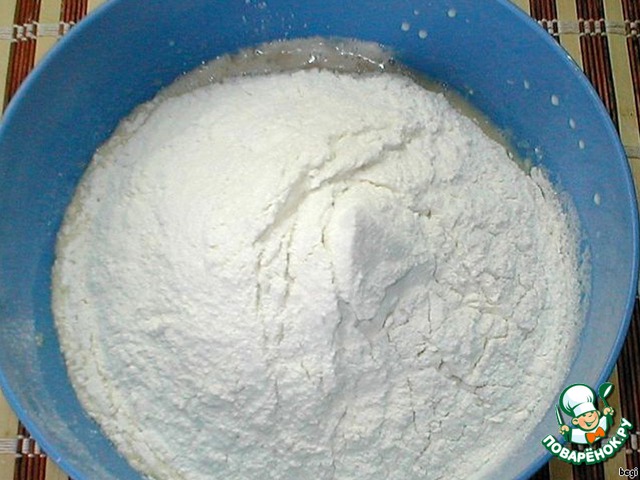 Все хорошо размешать (лучше взбить миксером), всыпать муку (лучше через сито, чтобы насытить ее кислородом) и замесить тесто.