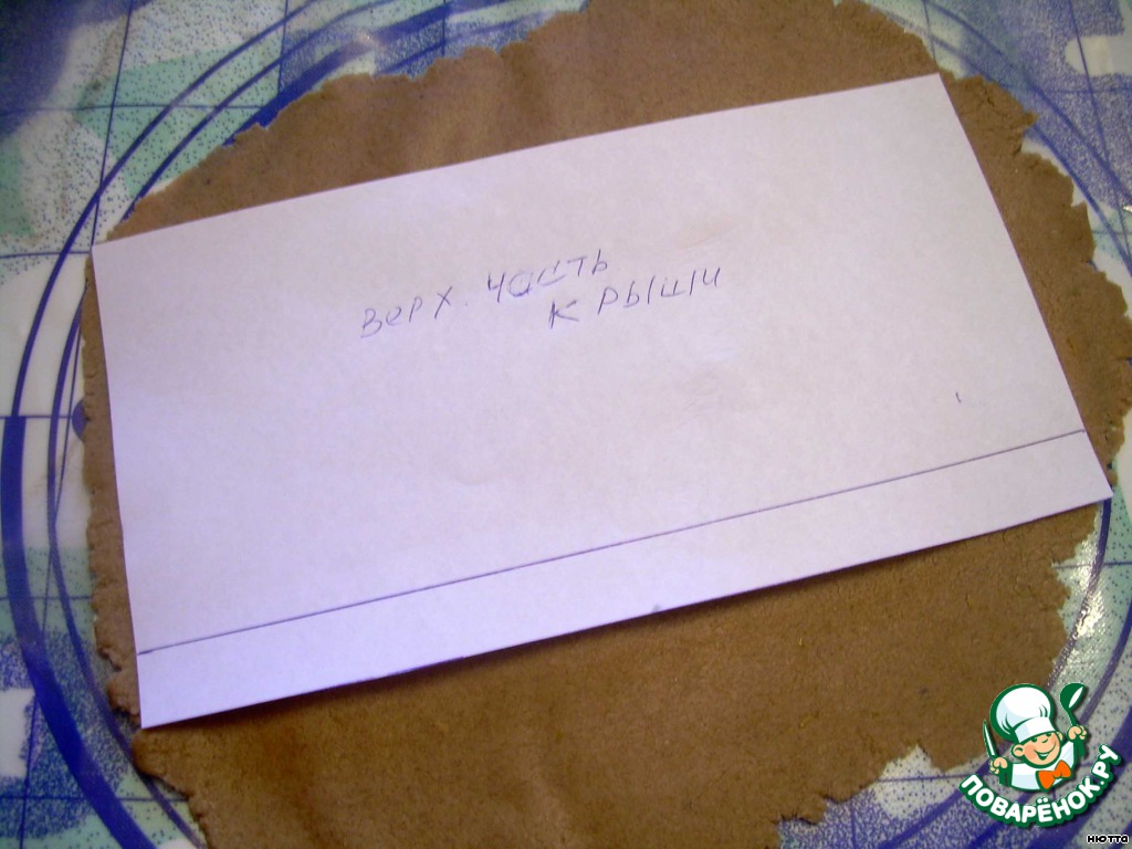 Пока вызревает тесто, подготовим выкройку для пряничного домика. Тут есть, где разгуляться фантазии, главное, точно подогнать все выкройки по высоте, длине, ширине... лучше вырезать выкройки из картона и собрать домик, чтобы увидеть неточности и нестыковки... Ну, вот и пролетела неделя, достаём из холодильника тесто, оно будет очень тугое, твёрдое, чтобы его размягчить, надо отрезать небольшие куски и смешивать с кусочками масла (у нас оставалось 100 г), до пластилиновости, мягкости теста, раскатываем на подложке, тесто послушное, не липкое. Для стенок домика раскатываем до толщины 0,5 см, для крыши - потоньше, вырезаем наши детали из теста...
