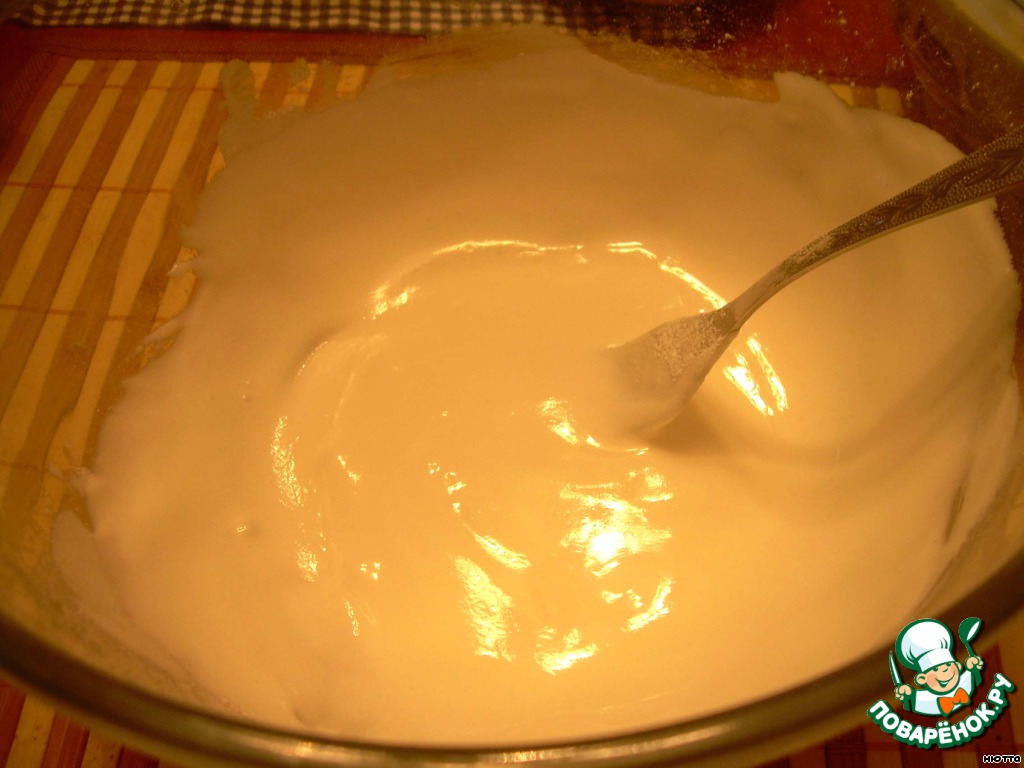 А теперь займёмся глазурью... белок яйца взбиваем вилкой, сахарную пудру (150 г, свежесмолотую и просеянную) по чайной ложечке добавляем в белок и взбиваем, взбиваем... глазурь получится гладкая, ровная, умеренно густая, не растекается, в ообщем, такая, какая нам нужна...