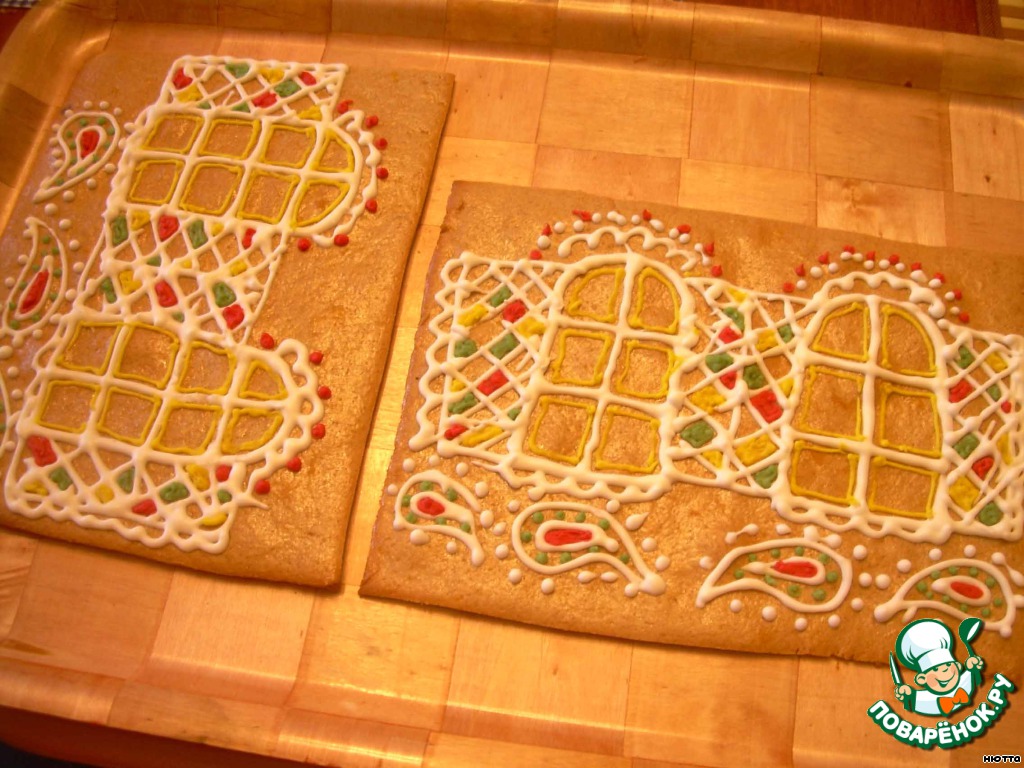 Расписываем стены домика белой глазурью, а потом цветной(можно использовать сахарные цветные карандаши или подкрасить глазурь красителями). Для росписи я использовала обычные файлы, выкладывала глазурь, затем тоненько срезала уголок и - вперёд! Да, глазури понадобится много, но замешивать нужно каждый раз свежую - на 1 белок, использовали, замешали новую...