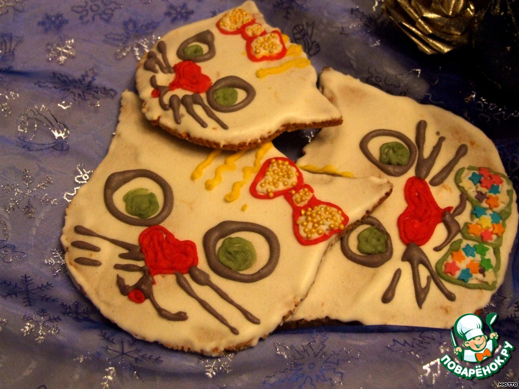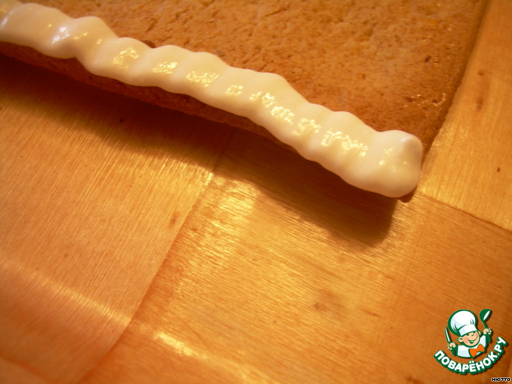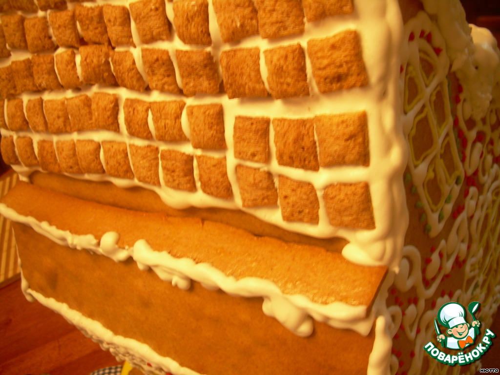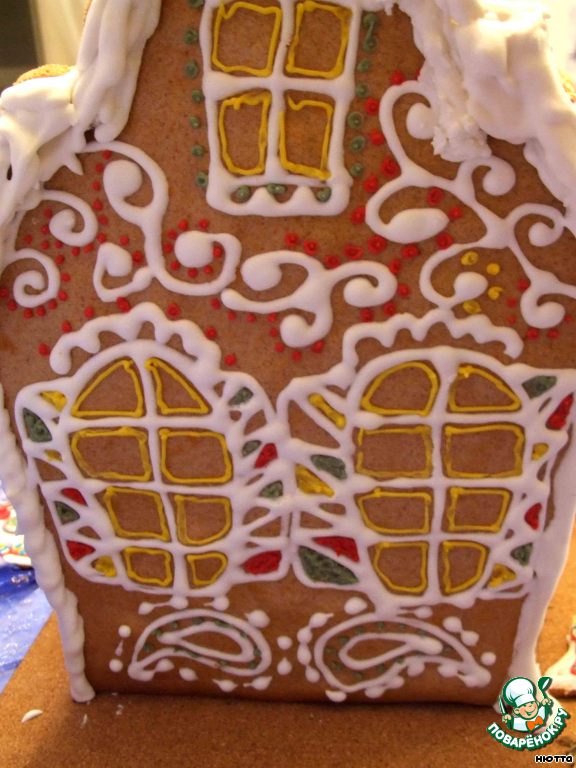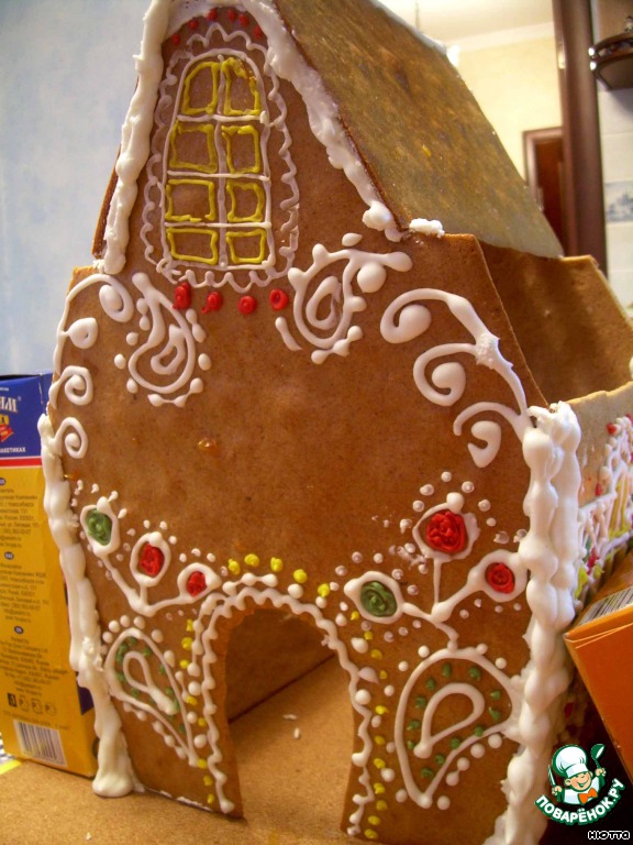 На домик приклеиваем пряничек, нанесём снег всё той же глазурью и вот... торжественный момент... Кошкин домик готов! Ур-р-р-р-а-а-а-а!!!