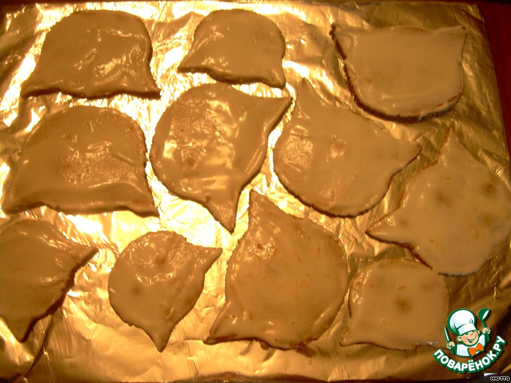 Вот наш домик и готов, но это же Кошкин домик! Поэтому делаем прянички-котята... после смазывания джемом прянички целиком смазываем глазурью с помощью шпателя...