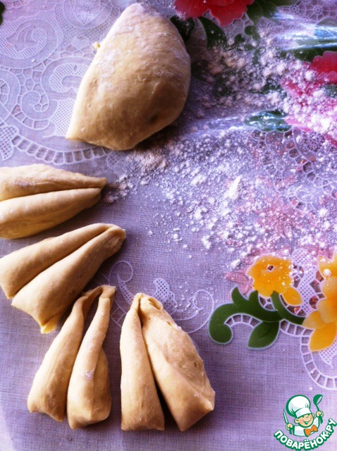 Спустя 30 мин. делим тесто на 16 равных частей. Сначала на 4 части, а потом каждую еще на 4.