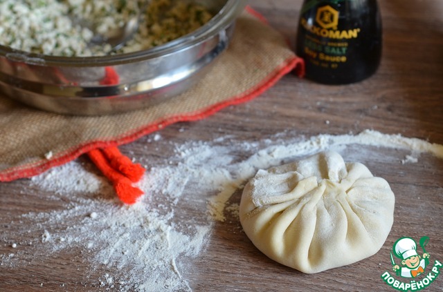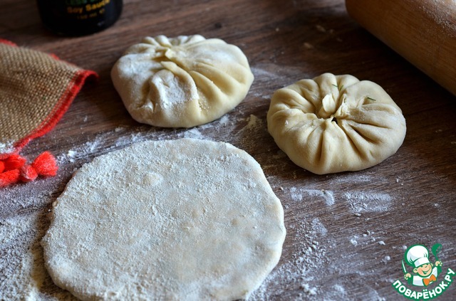 Из теста сформировать шарики, размером с яйцо. Раскатать, на середину выложить начинку.