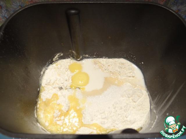 Добавляю просеянную муку, сахар, желтки, соль, размягченное сливочное масло, помещаю ведерко в хлебопечку, включаю режим замеса теста.