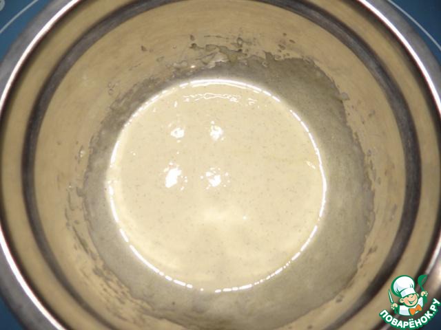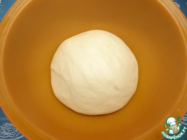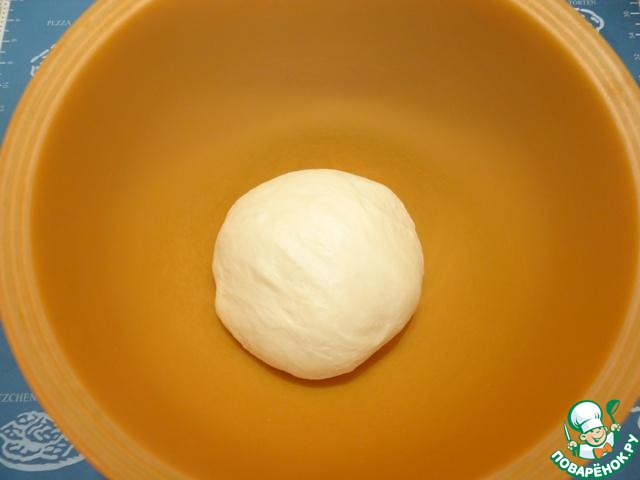 Для ускорения процесса подъема теста перекладываю его в миску, накрываю миску пленкой и убираю в чуть разогретую духовку. Тесто должно увеличиться в объеме в 2 раза.