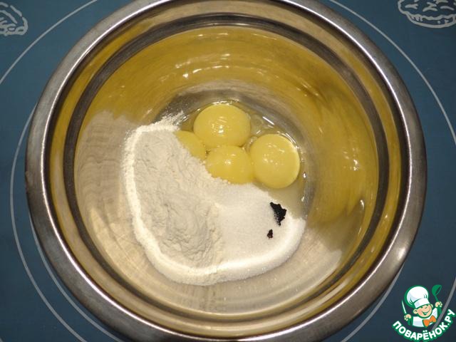В то время, пока молоко нагревается, соединяю в миске желтки, сахар, соль, семена ванили и просеянную муку