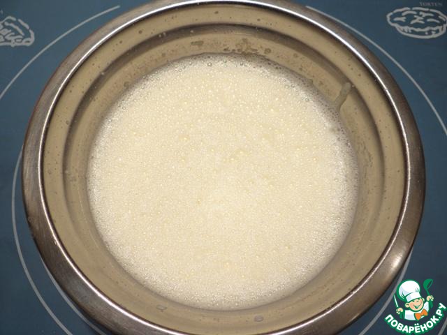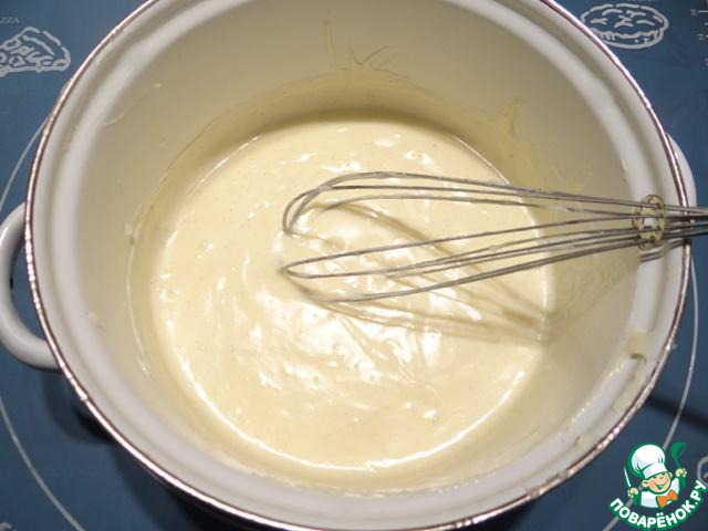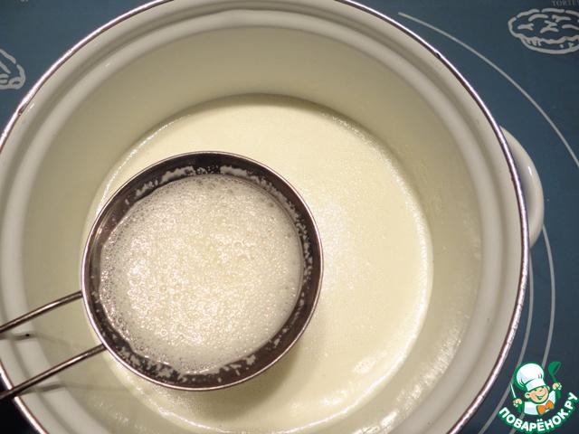В желтковую массу добавляю 2 столовые ложки закипевшего молока, сразу взбиваю. Затем, продолжая взбивать, добавляю оставшееся молоко.