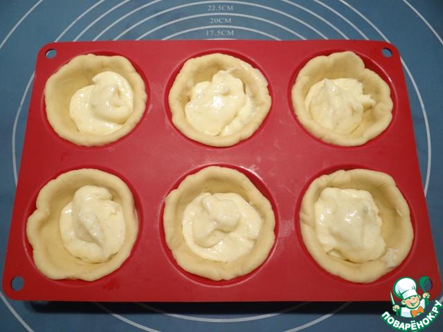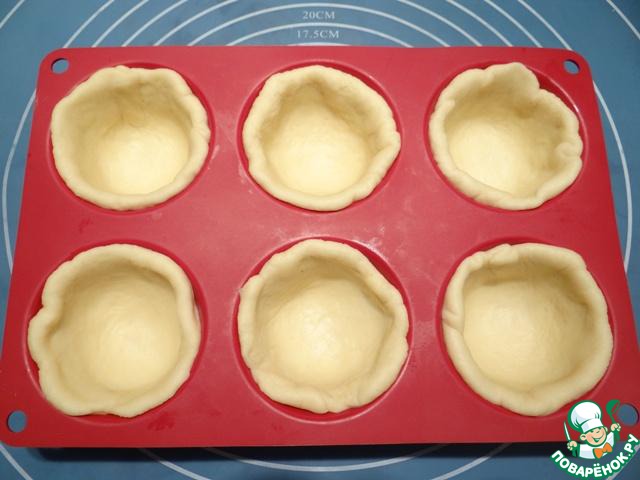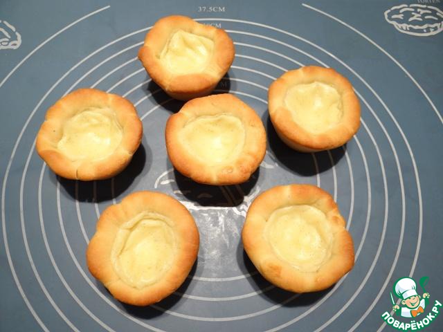 Затем в каждую корзиночку из теста добавляю примерно по 1-1,5 столовой ложке крема. Выпекаю корзиночки без расстойки в разогретой до 190 градусов духовке примерно 12-15 минут. Сильно запекать их не нужно!