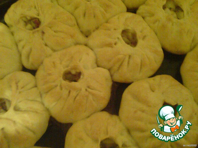 Выложить их на смазанный маслом противень, обмазать яйцом и выпекать 40 мин. при 180-200 градусах.