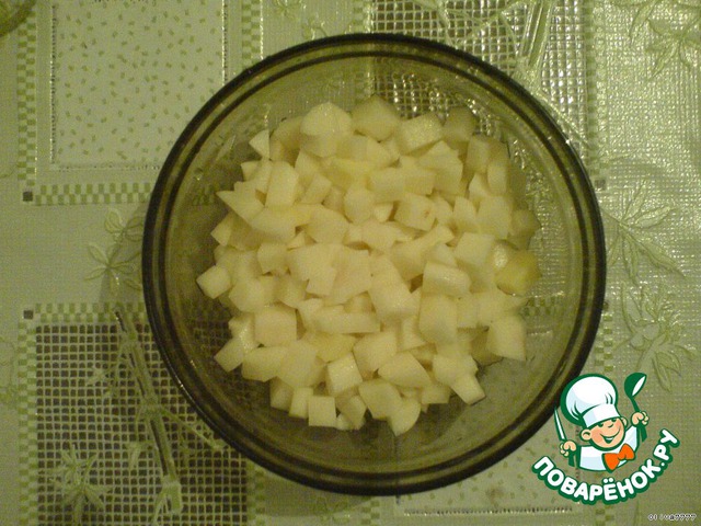 Лук нарезать кубиками и смешать с мясом и картошкой, добавить соль, перец по вкусу, приправу какую любите, я положила лавр и тмин - они хорошо сочетаются с картофелем, но Вы можете использовать ту, какую любите.