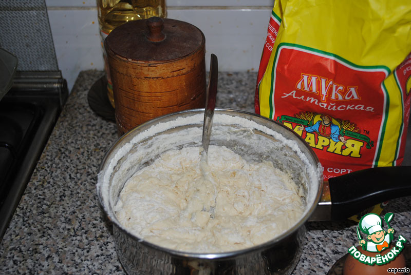 Вымешиваем тесто: простоквашу или кефир вливаем в емкость, разбиваем яйца, бросаем соду, соли немного, обязательно растопленный маргарин для придания мягкости, добавляем муку, сколько "возьмет", а после, укрываем тесто полотенцем или складываем в пакет минут на 20. Тем временем обжариваем лучок до золотистого цвета, ставим вариться картошку.