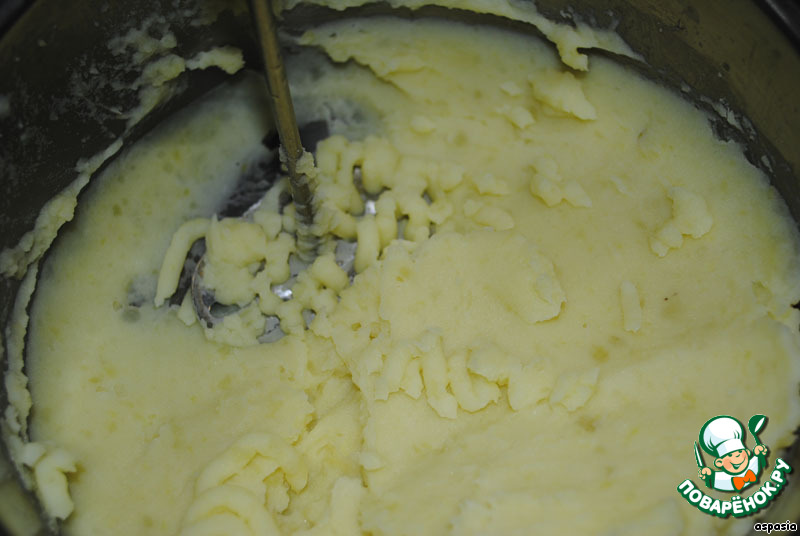 Готовим толченку (так говорят в нашей российской деревне), добавляя либо масло сливочное, либо сметану. Вмешиваем в нее лучок обжаренный - начинка готова!