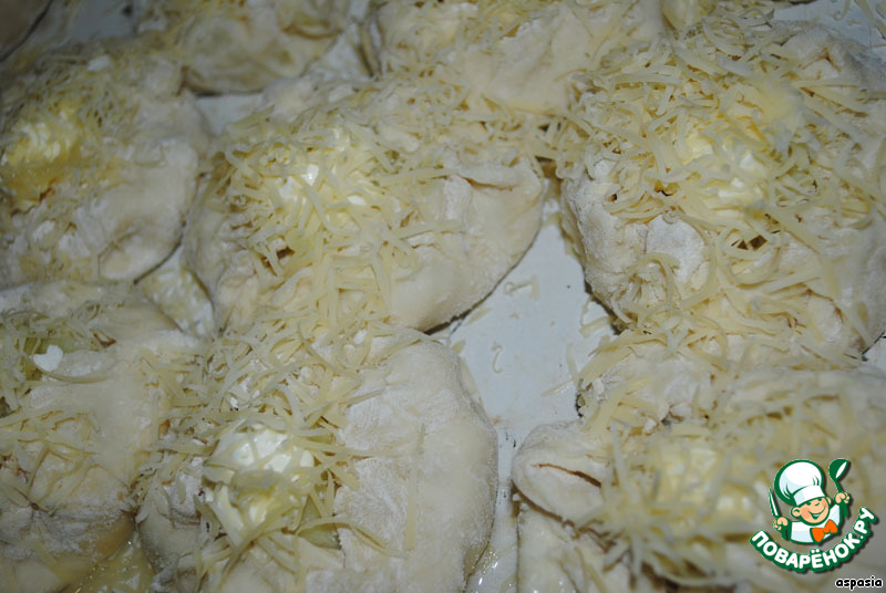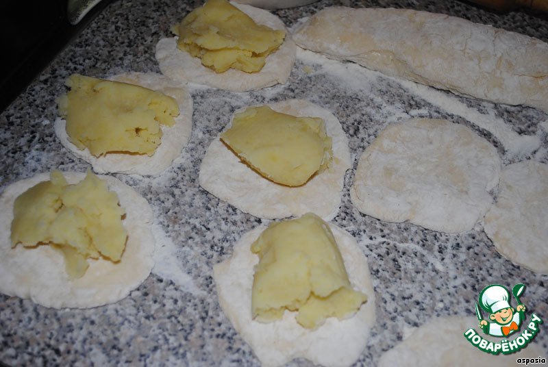 Готовим сочни на столе, присыпанном мукой, раскладываем на каждый начинку...