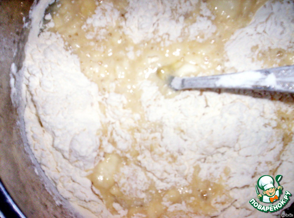 Затем добавим дрожжи и муку. Муку, из за своей природной лени, я не просеивала. И все равно получилось замечательно. Муку указала приблизительно, так как многое зависит от ее качества - тесто должно быть крутое.