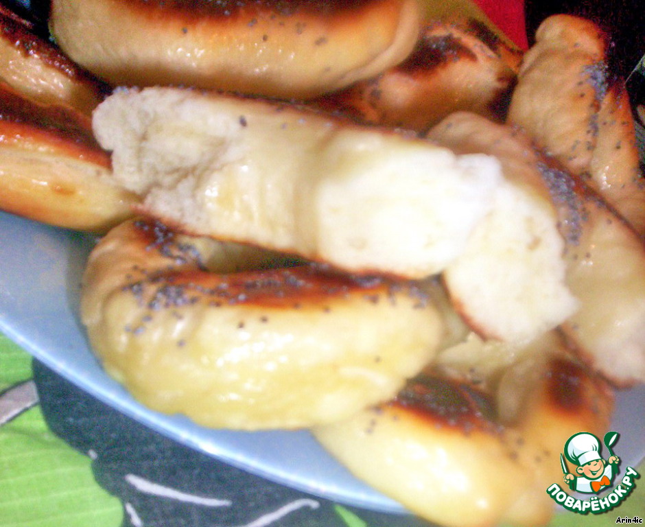 Затем выкладывайте на противень, выстланный бумагой для выпечки. Бумагу смажьте маслом. Укладывайте подальше друг от друга, так как при выпекании они еще увеличатся в размерах! Смажьте разболтанным яйцом и посыпьте маком! Выпекайте при температуре 200-220 град. 20 минут (до золотистого цвета). После выпекания смажьте сливочным маслом. Мякоть бублика очень нежная и пористая, на следующий день бублики были такие же мягкие и воздушные! Магазинные не идут ни в какое сравнение!