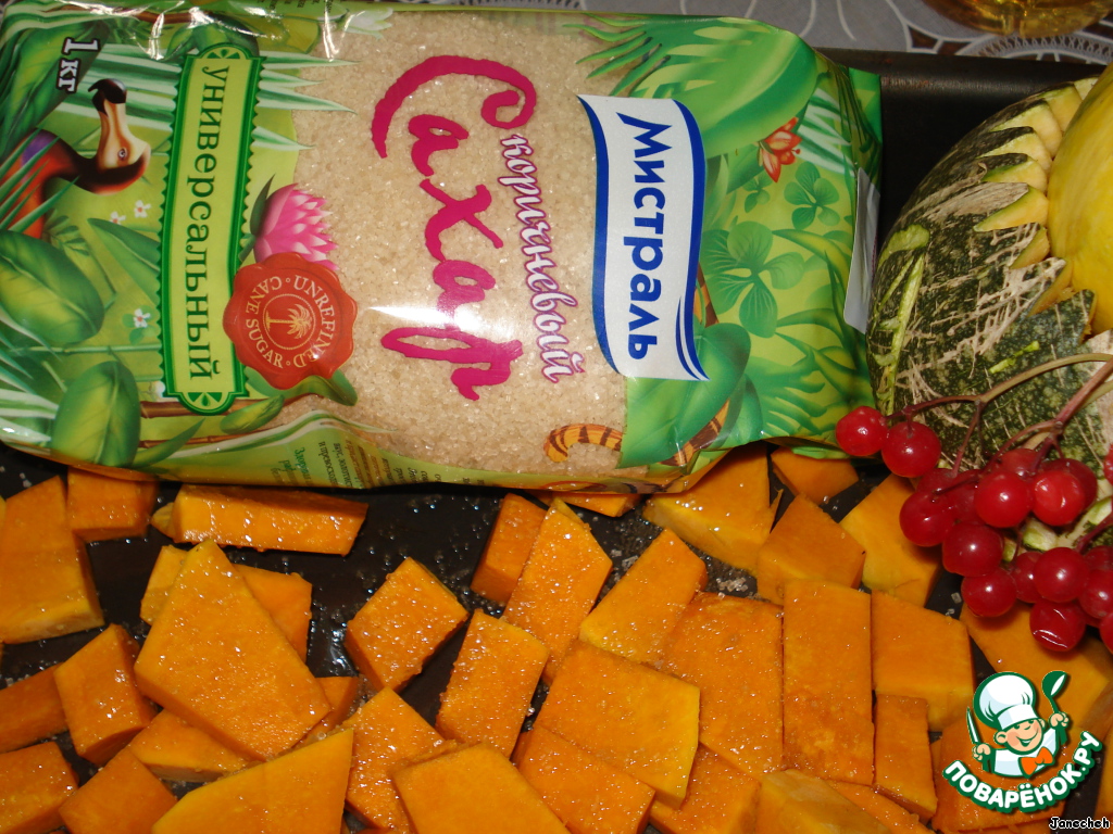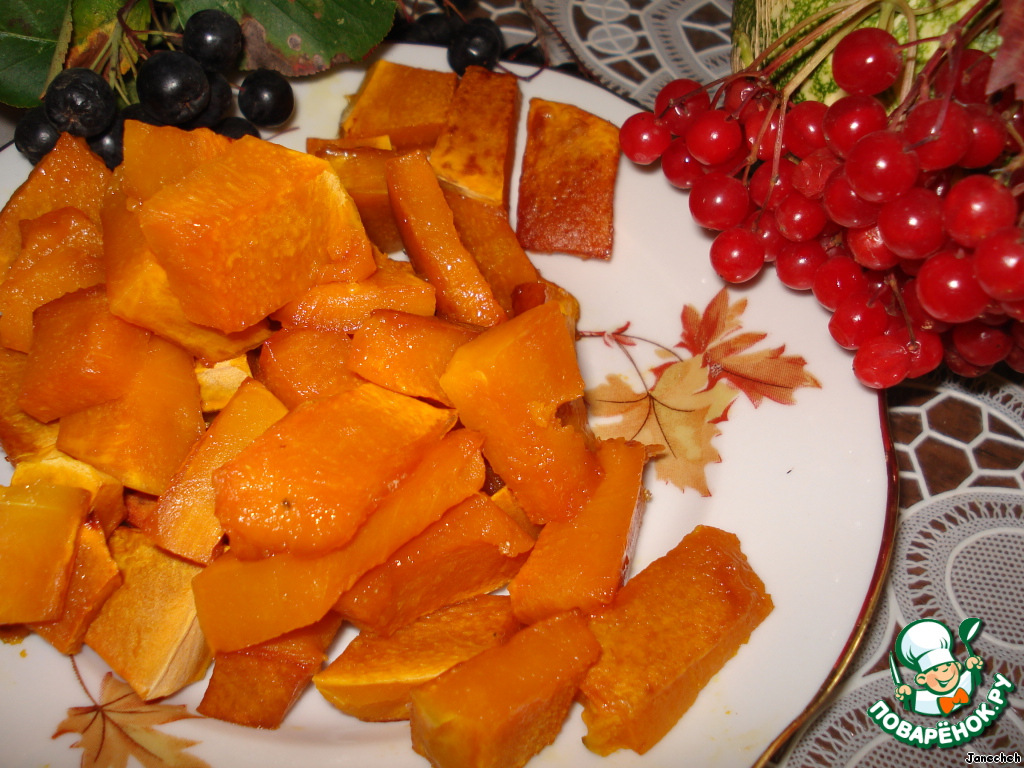 Тыкву нарезать кубиками, выложить на противень, посыпать сахаром, сбрызнуть маслом и поставить в духовку. Запекать при 180`C в течение получаса.