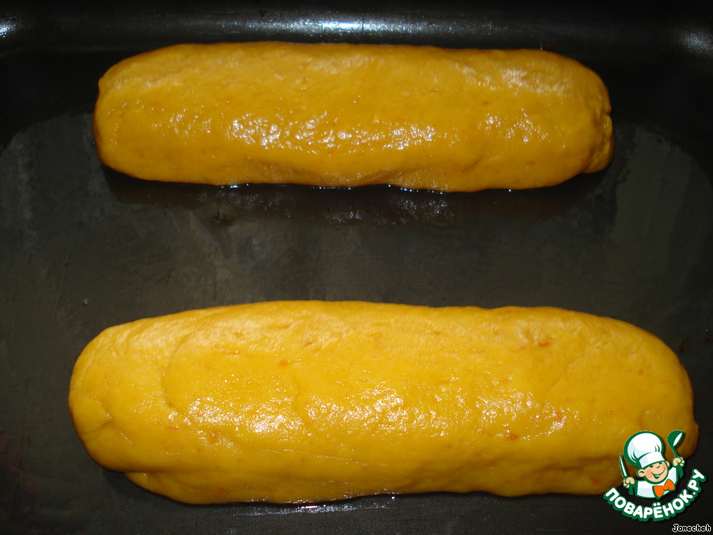 Форму для выпечки и руки смазать маслом. Разделить тесто на 2 части, слепить 2 батона, выложить их на противень. Выпекать батоны при 200`C 20 минут.