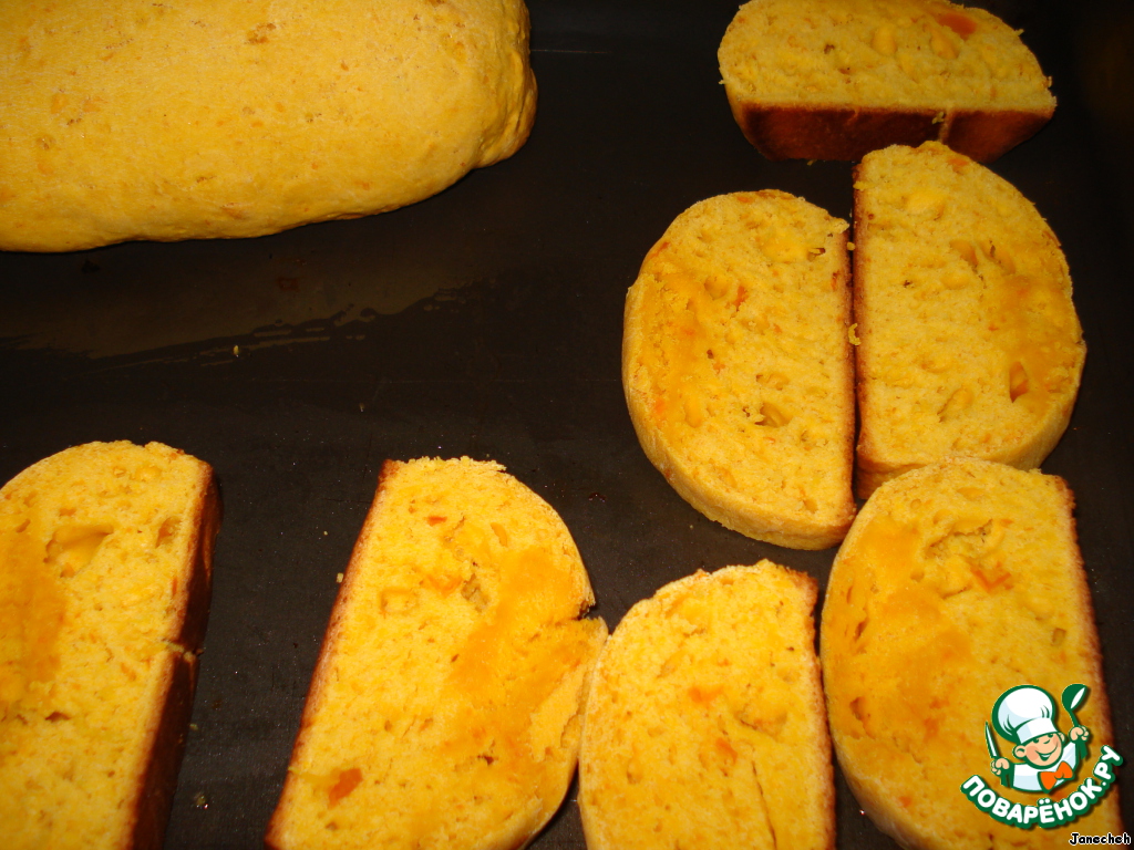 Затем вынуть, разрезать горячие батоны на ломтики, снова выложить на противень, выпекать при этой же температуре 10 минут, перевернуть на другую сторону, выпекать еще 10 минут.