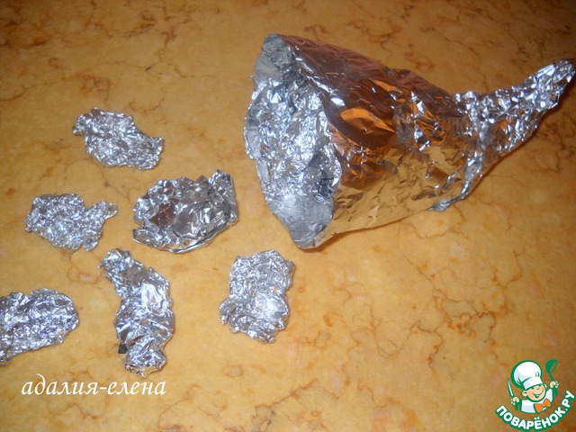 Приготовить каркас, на котором будет выпекаться тесто. Фольгу свернуть в форму кулька, загибая хвостик. Внутрь каркаса положить скомканую фольгу, чтобы форма не осела от тяжести теста.