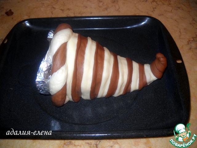 Взять каркас из фольги, сбрызуть его растительным маслом, положить на противень и наматать на него полоски теста. Каждая полоска теста должна ложиться на предыдущую на 0,5 см. Чередовать полоски по цвету. Аккуратно приподнять каркас и соединить полоски снизу. Из оставшегося теста скрутить 2 жгута, переплести их друг с другом и прикрепить к широкому концу.