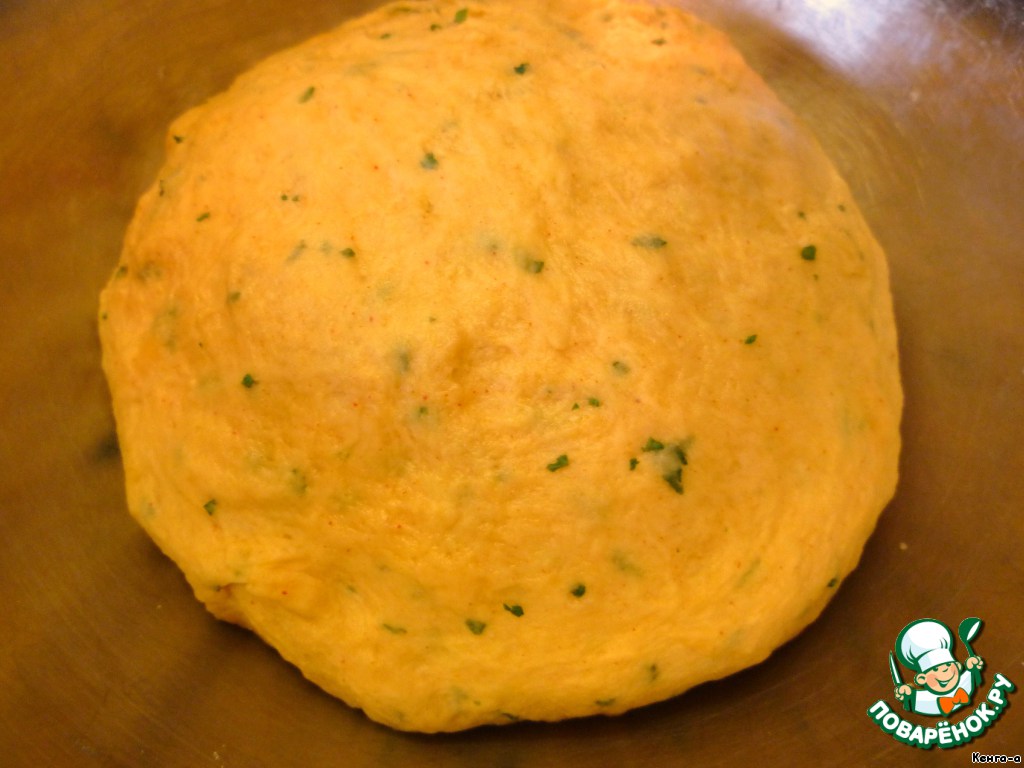Замесить мягкое тесто из воды, паприки, соли, масла и муки. Петрушку (или другую зелень) - ориентируйтесь на свой вкус. Но паприку желательно класть - постное тесто обычно плохо подрумянивается, а с паприкой оно уже румяное изначально.))