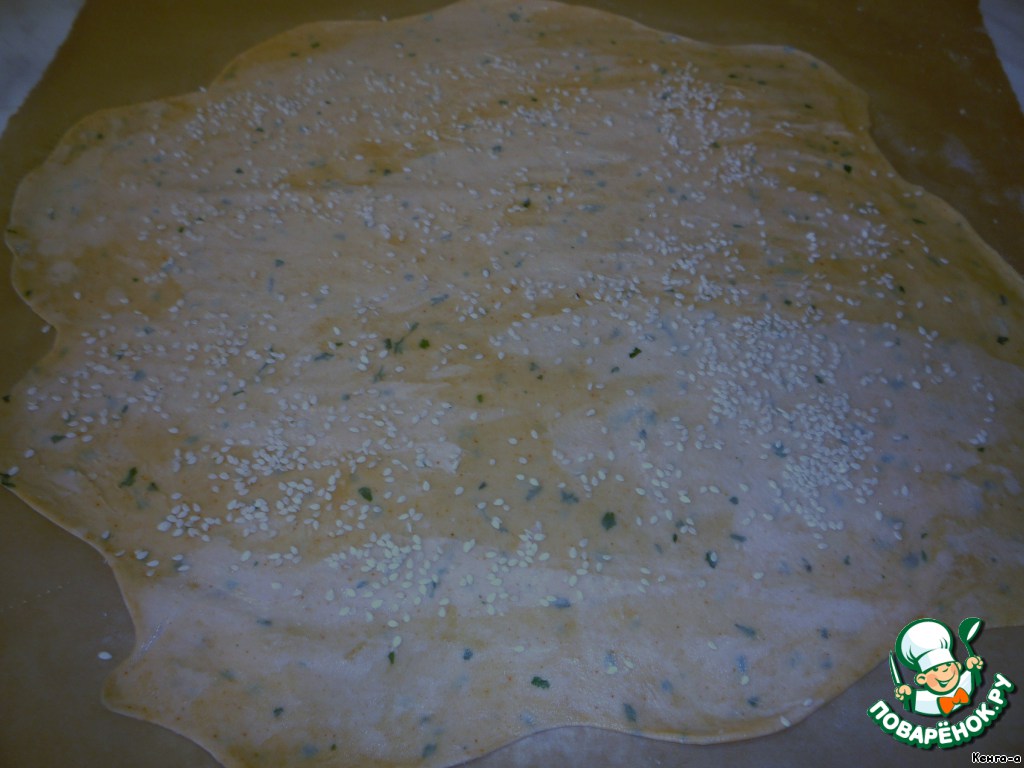 Смазать плат теста крепким чаем (я это делаю ладонью - быстро и удобно), посыпать щепоткой соли, кунжутом (или любыми травками) и похлопать сверху, чтобы кунжут не осыпался.