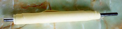 Накрутили слой на скалку, чтоб легче поднести и расстелить в противень.