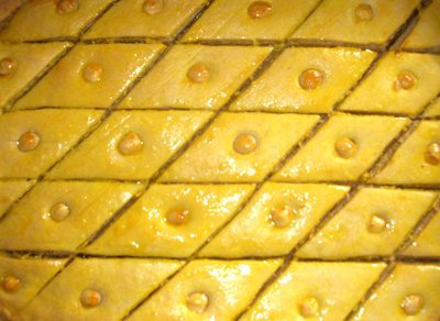 Расстилаем последний толстый слой на поверхность и нежным нажатием кончика ножа делаем набросок чертя линии (3,5см-расстояние между прямыми горизонтальными линиями на 5см-расстояние между линиями по диагонали) ,где потом мы должны будем в итоге разрезать пахлаву. Делим фундук пополам и втыкаем в центр каждого ромбика. Размешав сметану с куркумой, смазываем ею поверхность пахлавы.
