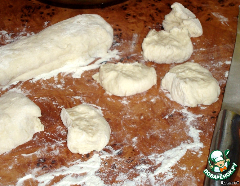 Теперь тесто разделяем на колбаски, нарезаем на маленькие кусочки.