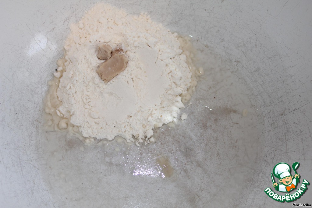 Готовим опару. Растворяем дрожжи в теплой воде, добавляем муку, соль, размешиваем и ставим в теплое место на 15 мин.