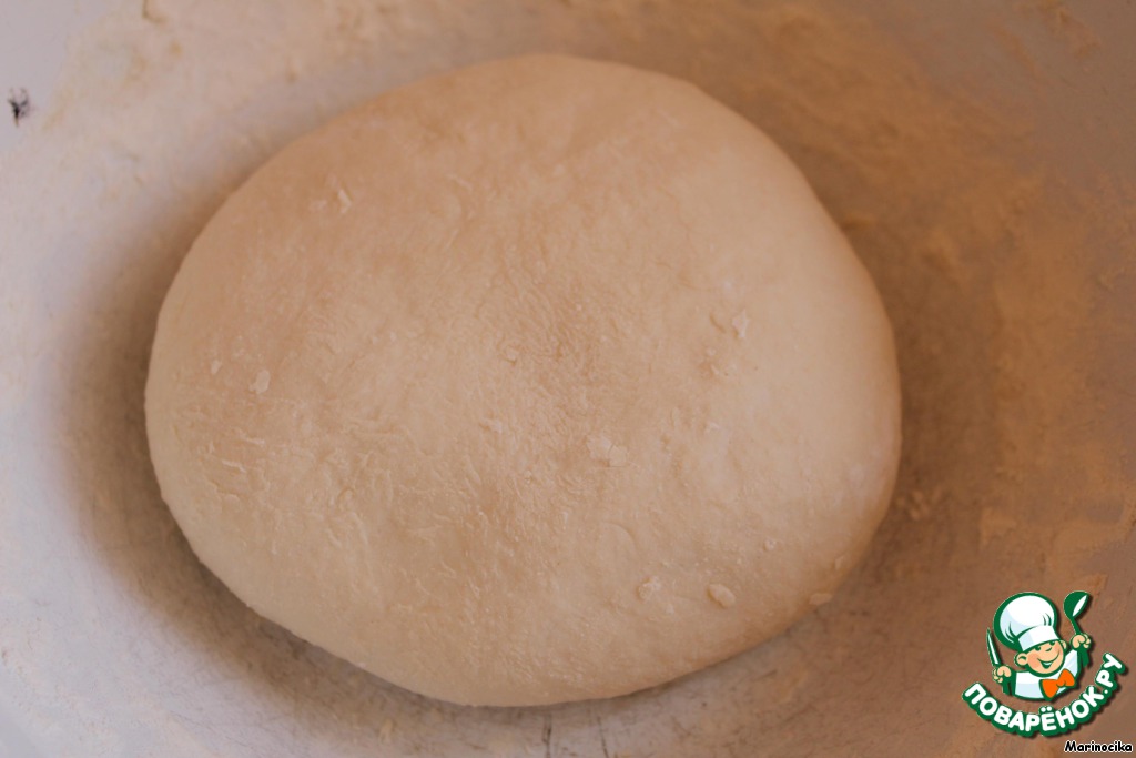 В опару добавляем растительное масло, теплую воду, муку, и замешиваем тесто. Тесто разминаем не менее 5 мин, накрываем полотенцем и на 30 мин ставим в теплое место.