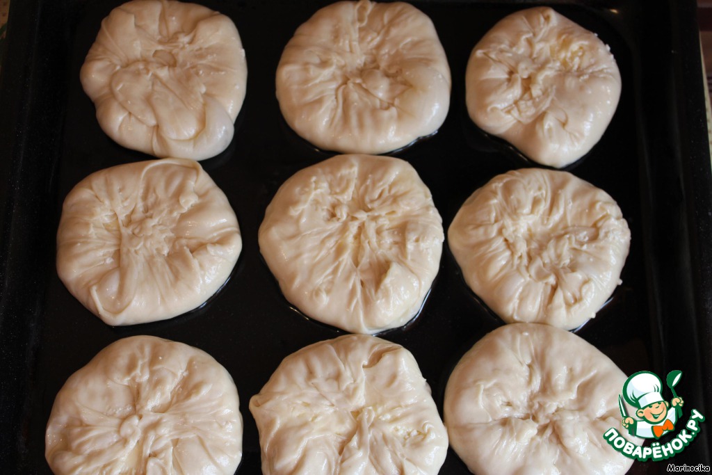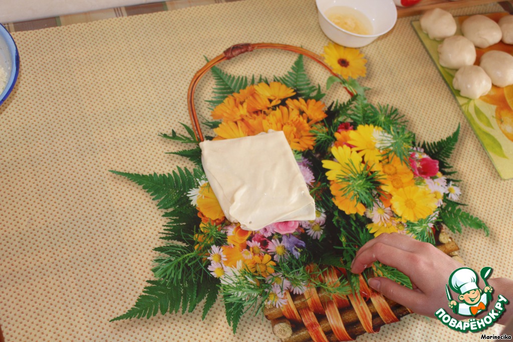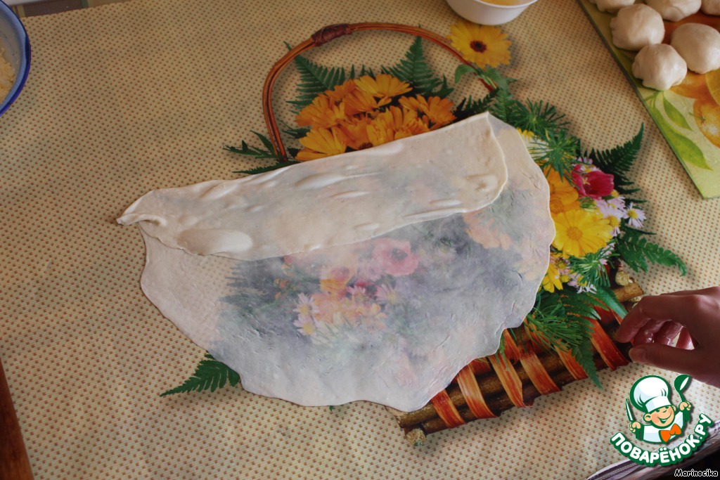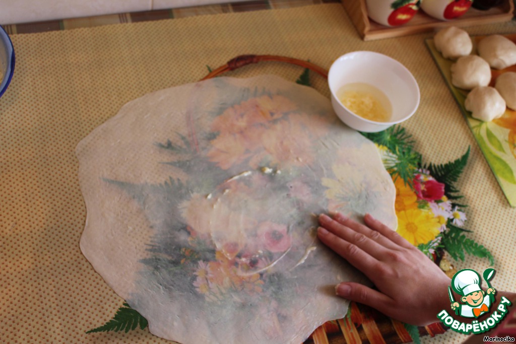 Стол смазываем маслом. Берем шарик, придавливаем в лепешку и смазываем маслом. Раскатываем его как можно больше по столу и сбрызгиваем слегка смесью.