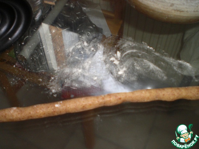 На следующий день отрываем от теста кусочки и раскатываем в колбаски толщиной в мизинец. Поскольку мизинцы у всех разные :-), то ориентируйтесь примерно на 1 см шириной.