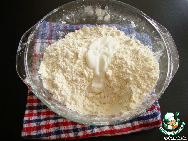 Смешать сметану и разрыхлитель в отдельной посуде, появятся пузырьки, добавить к предыдущей смеси.