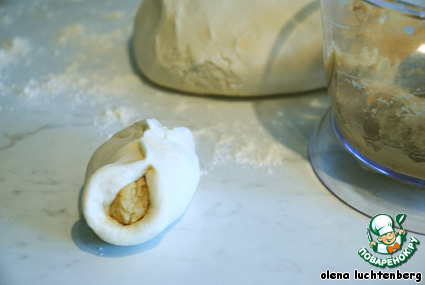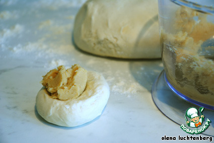 Тесто защипать вокруг начинки (как пирожок) и шов пирожка стянуть так, чтобы получился колобок из теста, а начинка оказалась внутри. Оставить колобок швом вниз на присыпанном мукой столе на 5-10 минут.