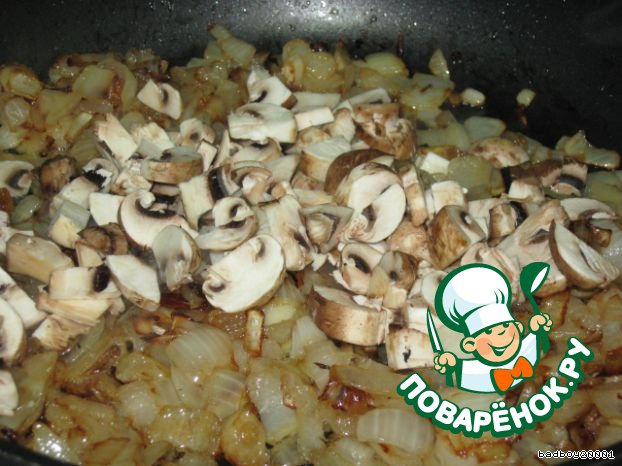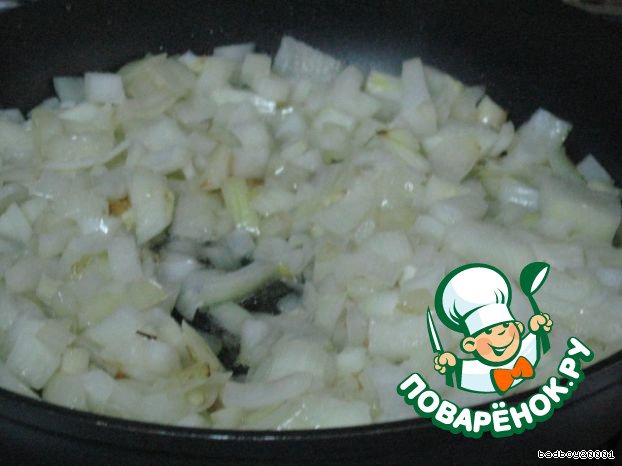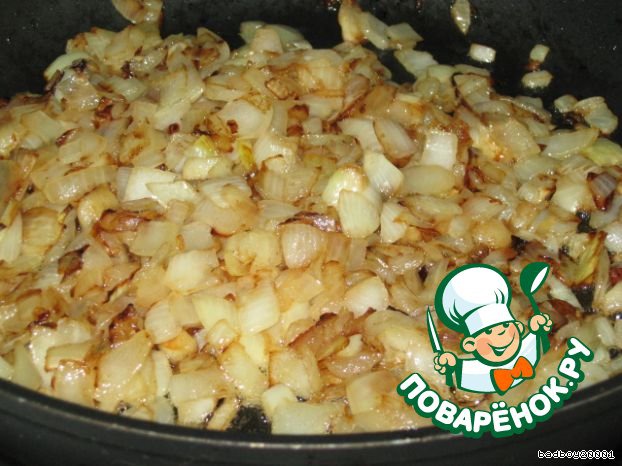 Вот тут она посолила и поперчила лук и начала помаленьким жменькам ( порциям) добавлять фарш