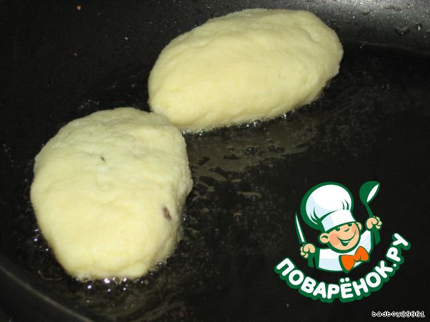 Одарка начала швом вниз класть картопляныки, на сковороду