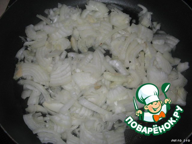Для начинки, лук нарезаем соломкой и обжариваем на растительном масле до золотистого цвета.