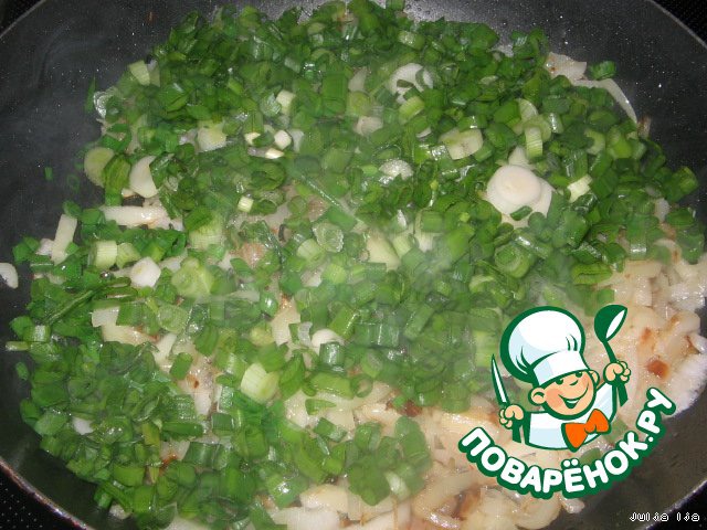Добавляем мелко нарезанный зелёный лук. Обжариваем вместе. Солим, перчим - по вкусу.