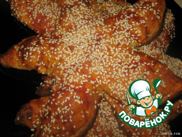 Посыпаем кунжутом, и выпекаем в, разогретой до 200 градусов духовке 15-20 минут.